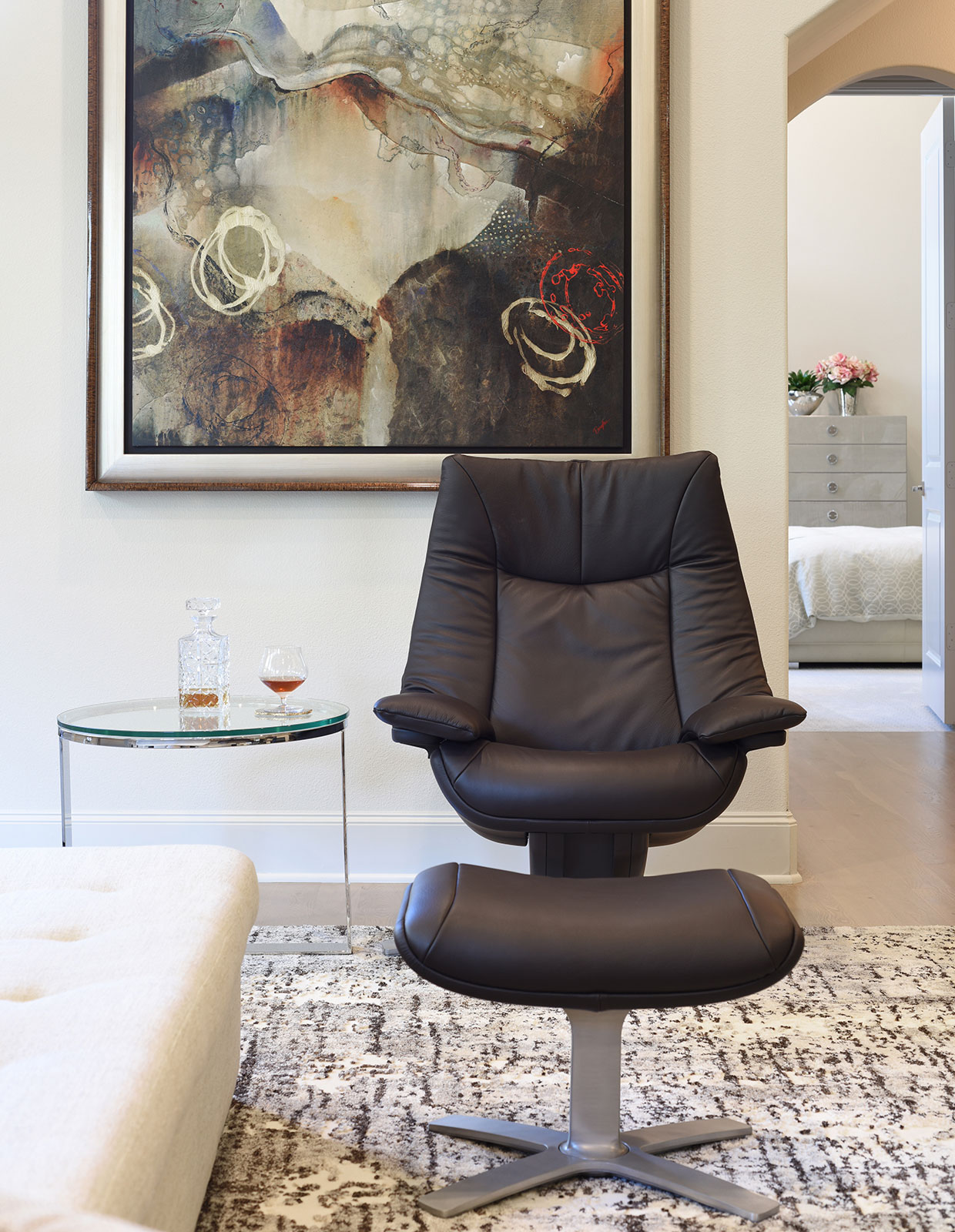 In fact, the foyer was one of the design team's favorite spaces too. “We wanted to design a fresh and unique space to welcome guests into their home,” the design team says. “We paired Malerba’s gorgeous Dress Code Collection table lamp, which is inlaid with horn, with our McCartney Chair, a funky hair on hide rug and a wall-mounted console, to create an eclectic and inviting atmosphere.”
