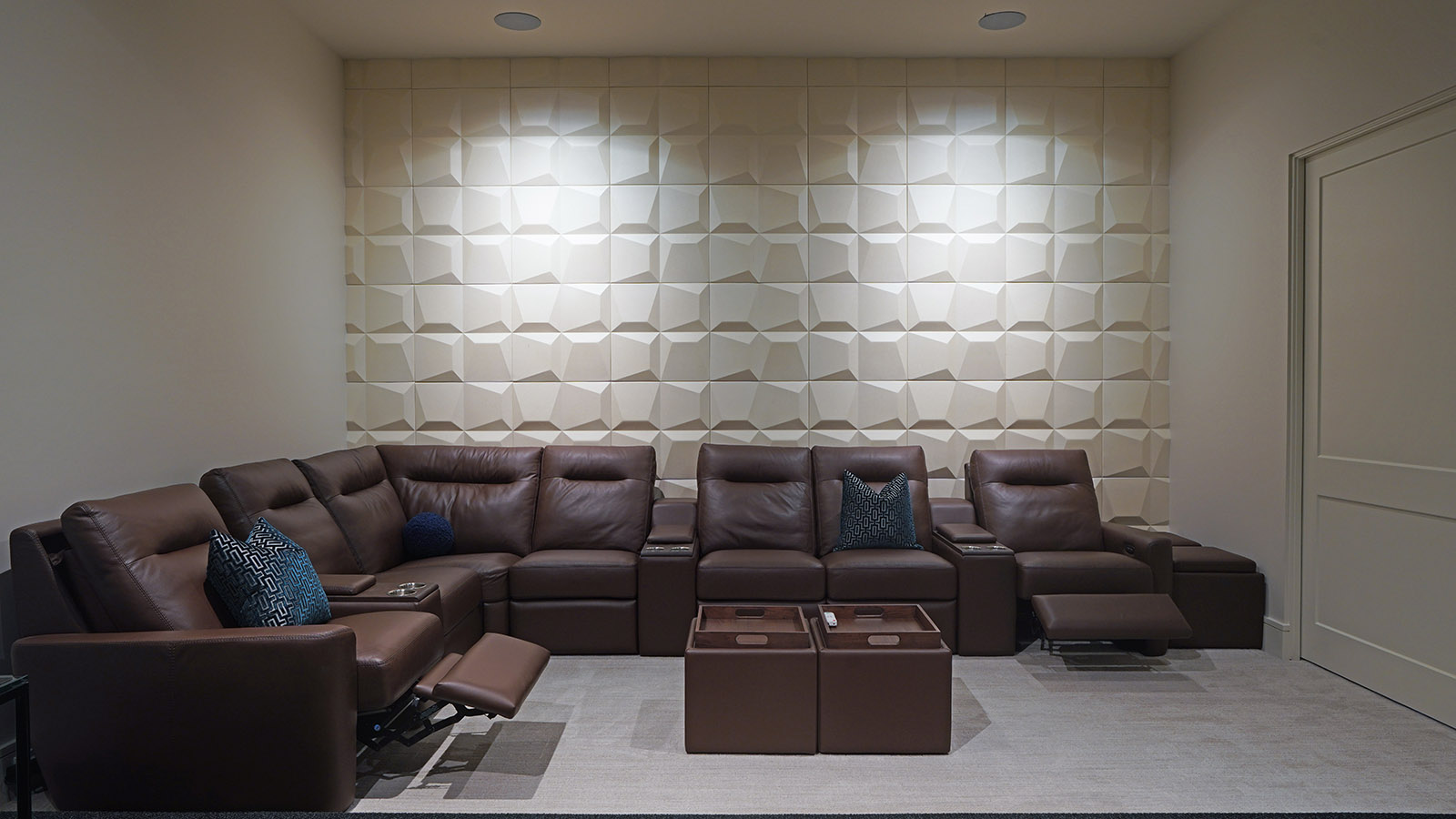 Avid golfers, the homeowners also requested a dedicated golf simulator and putting green, transforming part of the home into a personalized recreational space. Bailey approached the media and simulator room with comfort and scale in mind, selecting seating and media furnishings that maximize both viewing and play, while maintaining the home’s refined, contemporary aesthetic."