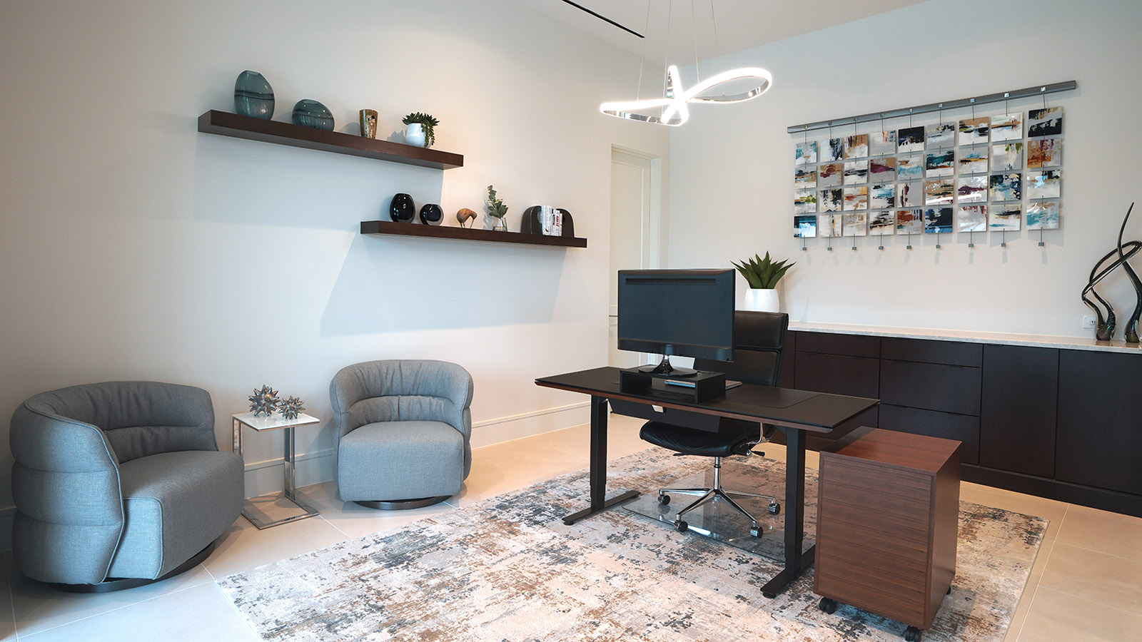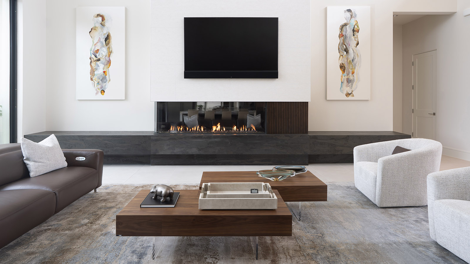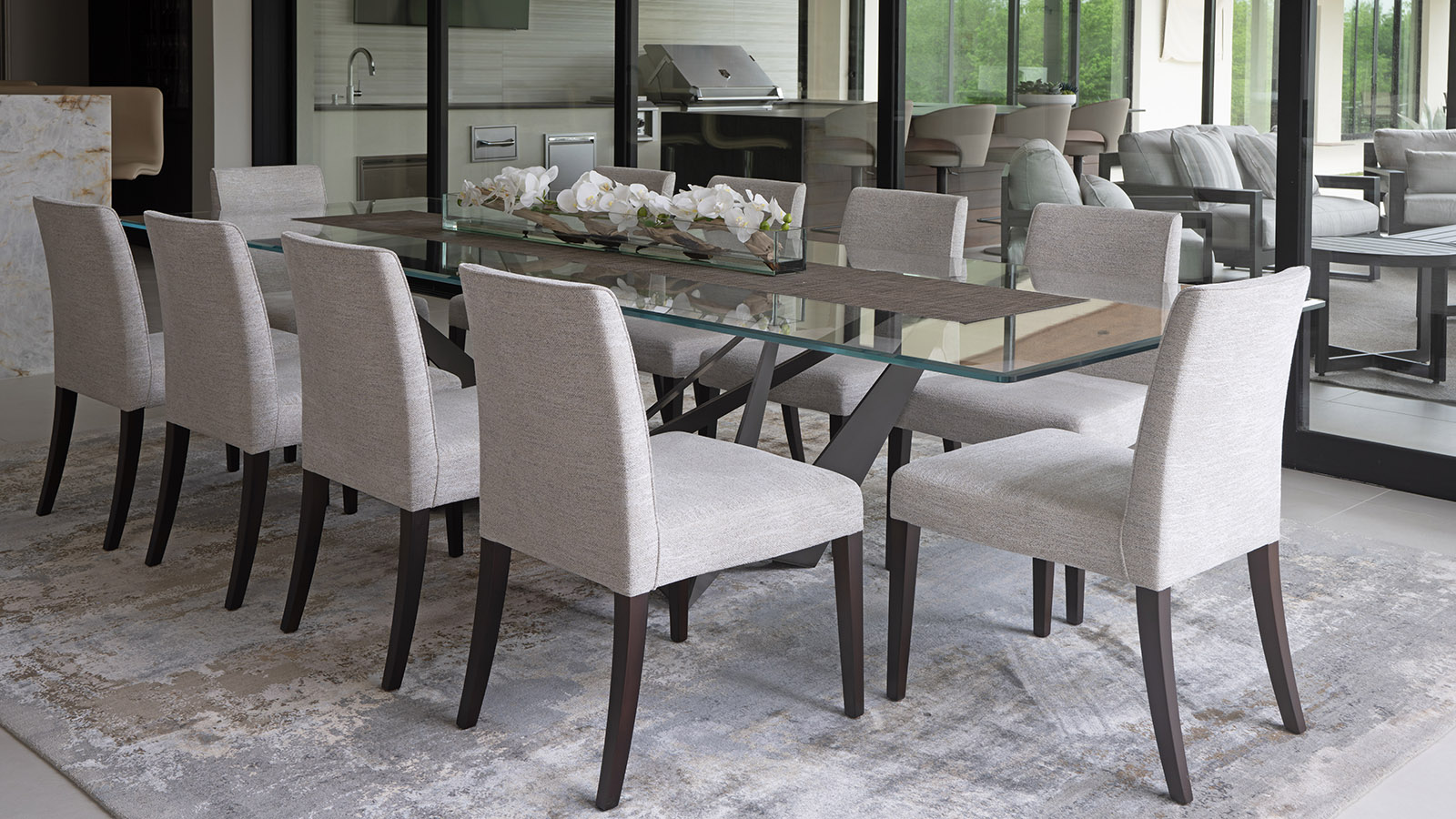 Several architectural challenges required thoughtful solutions. The expansive living room, paired with soaring 22-foot ceilings, demanded art and area rugs scaled appropriately to the volume of the space. Finding a rug large enough, and loved by everyone, took time, with a seven-month production period, but the result was worth the wait. Custom-scaled artwork and carefully proportioned media furniture ensure that the room feels balanced, grounded, and visually cohesive despite its grand proportions.