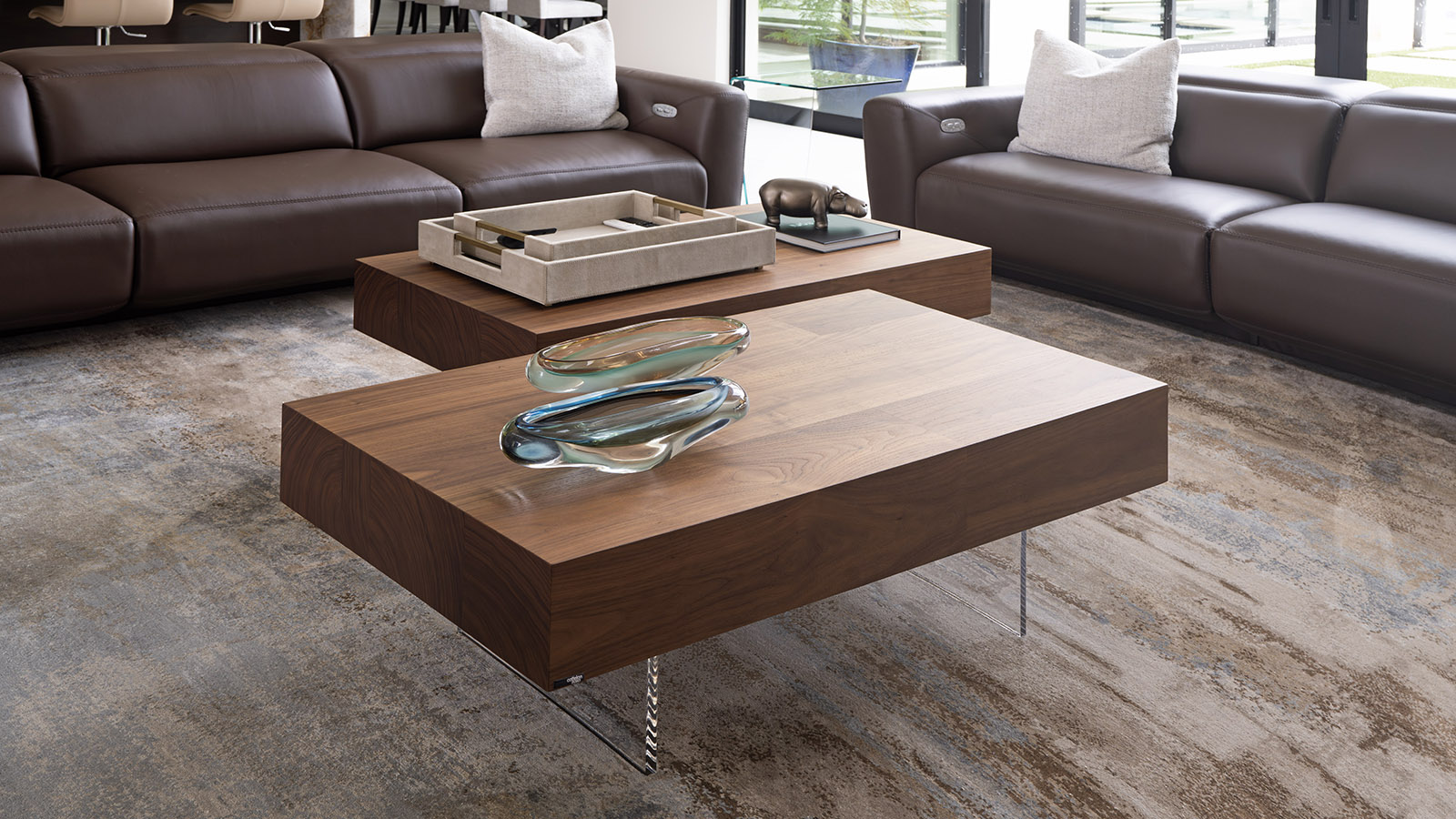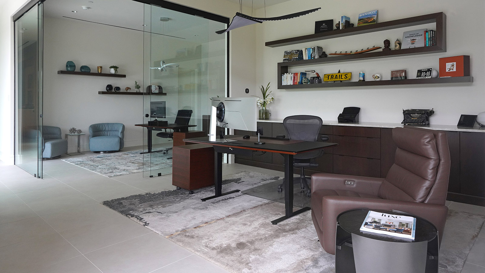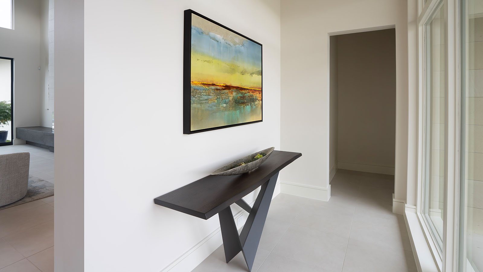 Several architectural challenges required thoughtful solutions. The expansive living room, paired with soaring 22-foot ceilings, demanded art and area rugs scaled appropriately to the volume of the space. Finding a rug large enough, and loved by everyone, took time, with a seven-month production period, but the result was worth the wait. Custom-scaled artwork and carefully proportioned media furniture ensure that the room feels balanced, grounded, and visually cohesive despite its grand proportions.