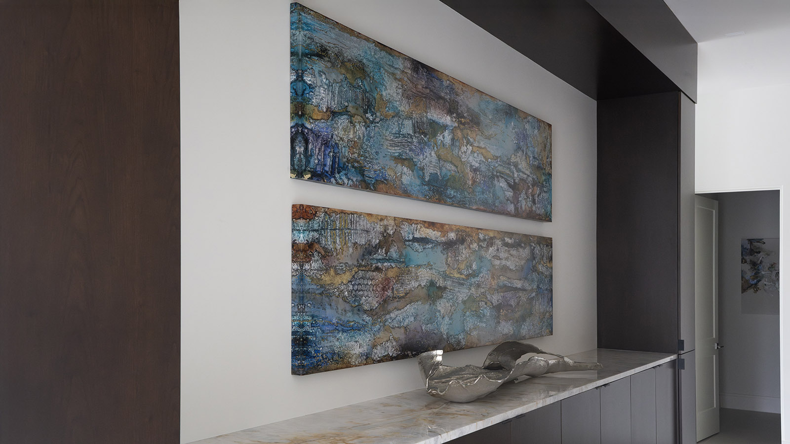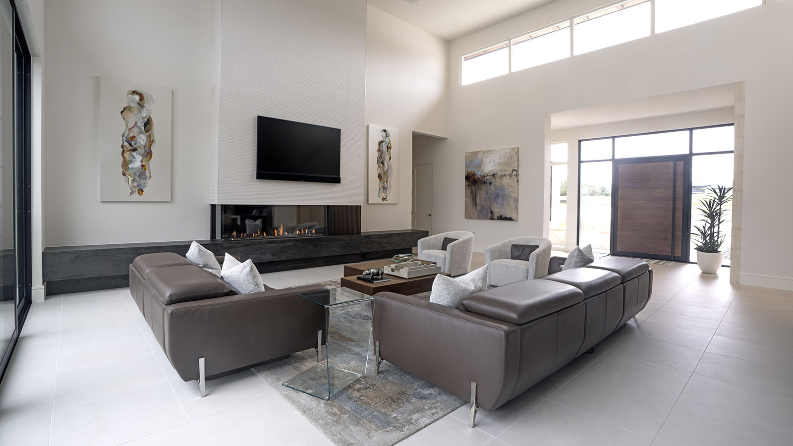 Several architectural challenges required thoughtful solutions. The expansive living room, paired with soaring 22-foot ceilings, demanded art and area rugs scaled appropriately to the volume of the space. Finding a rug large enough, and loved by everyone, took time, with a seven-month production period, but the result was worth the wait. Custom-scaled artwork and carefully proportioned media furniture ensure that the room feels balanced, grounded, and visually cohesive despite its grand proportions.